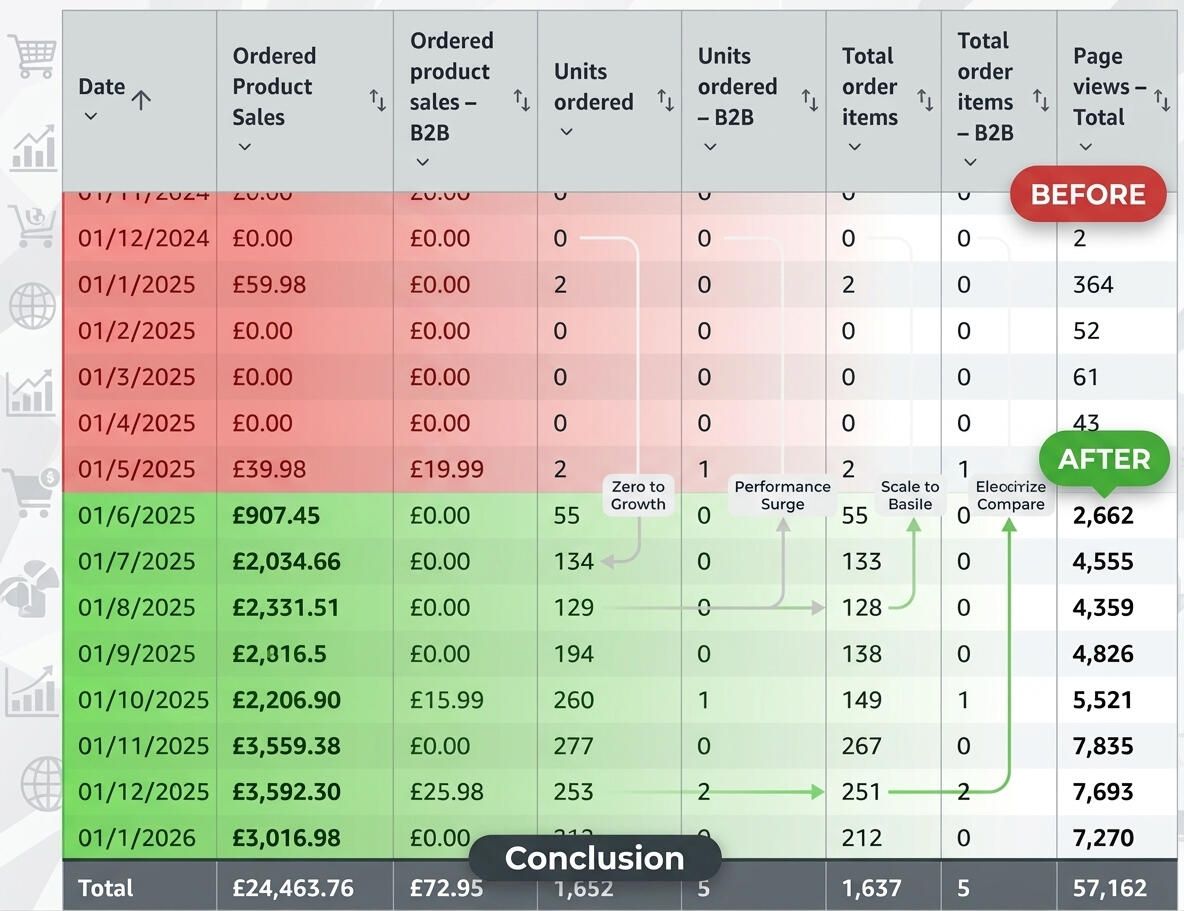 An automotive brand in the UK marketplace had fragmented listings and poor PPC performance, leading to low visibility and inconsistent sales.Challenge