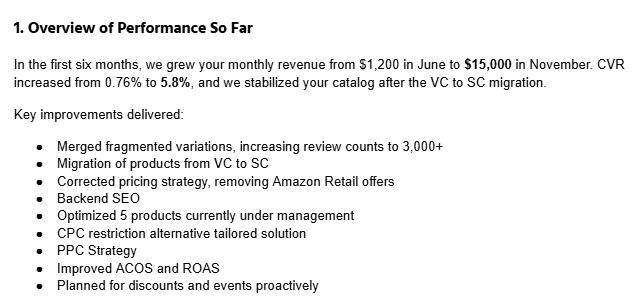 I don’t just “run PPC” or “manage listings”, I manage the entire Amazon ecosystem to help brands grow sustainably, improve profitability, and scale with confidence.